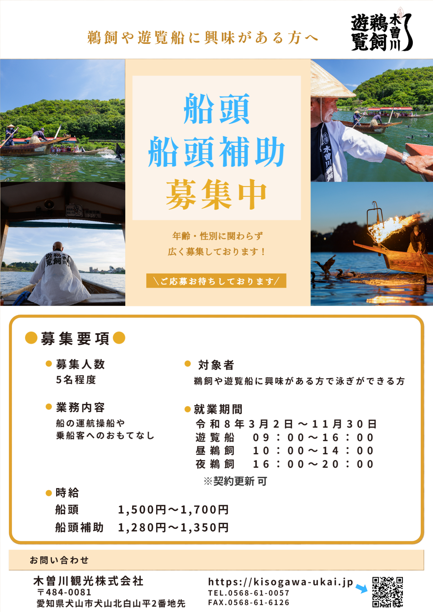 木曽川観光㈱では、遊覧船の船頭及び船頭補助の募集を行います。